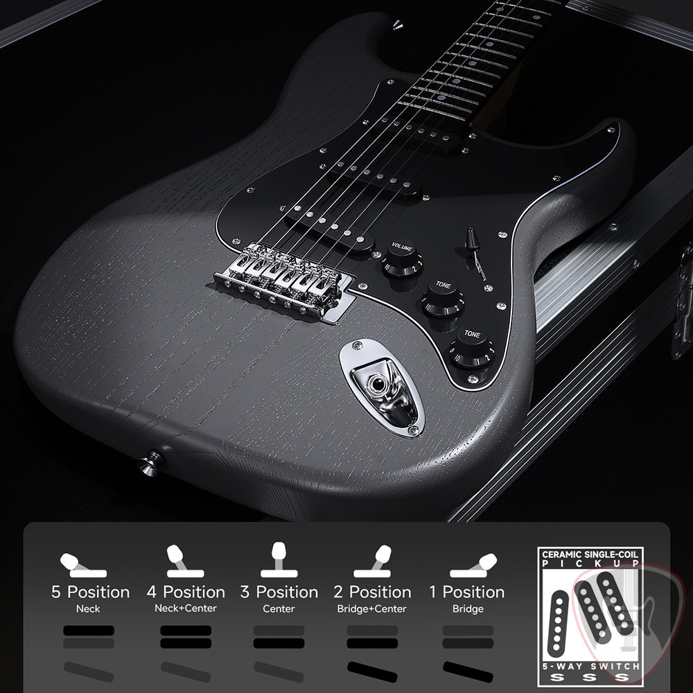 Tartozékok: 5 wattos erősítő, capo, húr, heveder, gitártok, imbuszkulcs, tremoló kar